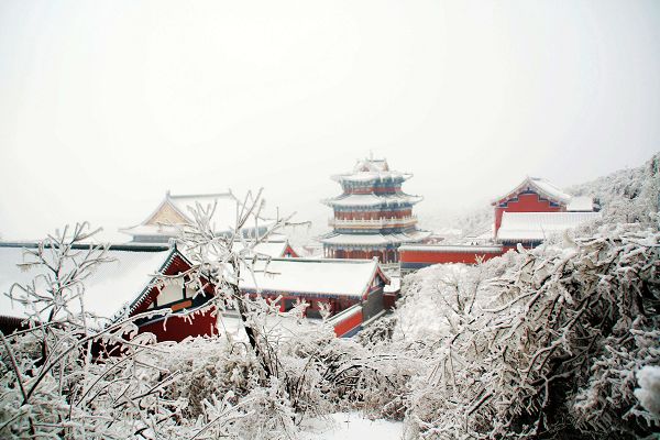 順著路一直走走拍拍,連不愛照相的俺都忍不住吆喝著來一張來一張。俺兄弟一邊拍一邊不惜余力地打擊俺:您老就別糟踐這美景了。走在鬼谷棧道,一側是山壁,一側是霧氣籠罩的懸崖,后來又下起雪來,真有點深山求仙的味道。其實一路走來并不累,就是總不得不從被冰掛壓倒的樹下鉆身而過,累得腰酸。再有就是俺一度說要雪盲了,眼睛都有點發(fā)花。最后終于到了頂端的天門山寺。確實要承認,在這樣的一番情景之下,佛性也顯得格外深沉,連那個向來不信的家伙也雙手合十。本來還想隨喜瞻仰一下佛祖真身舍利的,可被那個賣票的痞子樣給雷到而作罷。
