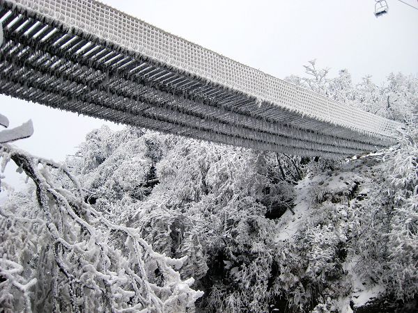 由于淡季,不用排隊很快坐上了索道,前前后后的轎廂內都沒人,俺倆坐著好不優(yōu)哉。索道漸次翻越而后陡然爬升,進入乳白色的氤氳之中,最后全被濃厚的霧氣包裹,像在云霧中漂移。俺又爽又驚,心想神仙還真不是好當?shù)???粗懊娴牟僮髡f明:沒事,這個挺先進的,碰到惡劣天氣會自動停止運行。話音剛落,它就停了,然后左右左右的晃啊晃啊。俺顫顫地問:怕嗎?他說:嗯……還,還成。俺喃喃地道:靠,俺可不想死呢……終于正襟危坐地熬過了那幾分鐘的晃悠,繼續(xù)上行后,霧氣淡了許多,這才看到索道支架和輪軌竟然都凍上厚厚的冰掛。心肝一顫:不是吧,這是到哪了啊?!