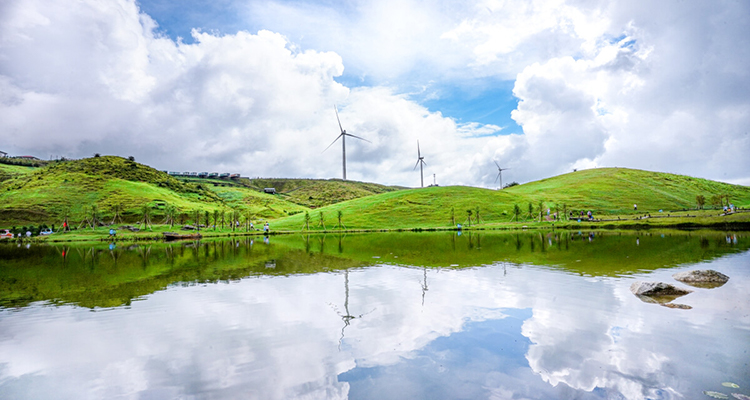 3、風(fēng)車群:山脊之上,數(shù)十座白色風(fēng)車擎天而立,巨大的葉片在風(fēng)中悠然轉(zhuǎn)動(dòng),與翠綠的草地相互映襯,構(gòu)成了壯觀而又浪漫的風(fēng)景線。沿著風(fēng)車步道漫步,微風(fēng)拂面,風(fēng)聲、風(fēng)車轉(zhuǎn)動(dòng)聲交織在一起,宛如奏響了一曲自然的樂章。