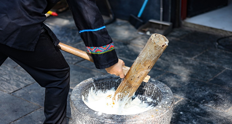 打糍粑:農(nóng)家過(guò)年時(shí),會(huì)用糯米蒸熟后捶打成糍粑,象征團(tuán)圓美滿,常蘸糖或包餡食用。