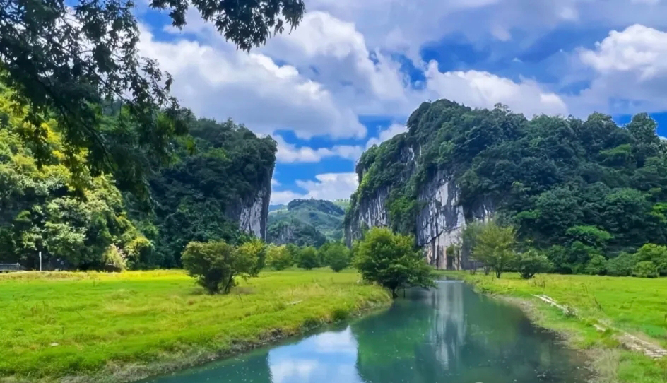 湄江的地質(zhì)奇觀令人嘆為觀止。蜿蜒的湄水如玉帶般穿梭于崇山峻嶺之間,兩岸百丈高崖直插云霄,形成綿延十里的峭壁畫廊。這里的巖溶地貌發(fā)育之完整堪稱教科書級別:從幼年期的溶溝石芽,到中年期的峰林峽谷,再到晚年期的孤峰殘丘,完整呈現(xiàn)了巖溶地貌的生命周期。