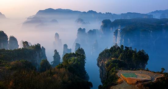 袁家界是電影《阿凡達(dá)》中“哈利路亞山”的取景地,你可以在這里探尋電影中群山漂浮、星羅棋布的魔幻世界。如果碰巧山中下起了小雨,或是等到雨后初晴,更能欣賞到霧氣彌漫、群峰疊嶂的美景。迷魂臺是理想的觀景位置,站在臺上,四周有上百座石峰矗立,氣勢磅礴。這里還能看到橫跨于兩山之間,垂直高差357米的天下第一橋。