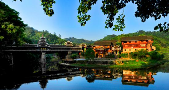 皇都侗寨由頭寨、盤寨、尾寨、新寨共同組成。前三個(gè)寨子連為一體,新寨則是處于一個(gè)半島上,由風(fēng)雨橋(普修橋)和公路相通,與另三個(gè)寨子隔河相望。